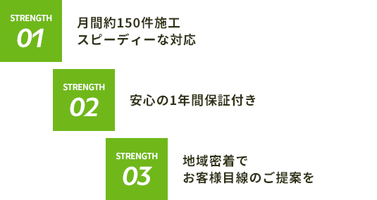 弊社の強みは、スピーディーかつ高品質な施工です。月間約150件の施工を行っており、スピードには自信があります。もちろん、仕上がりや品質もこだわっておりますので、速さだけではなく、お客様に満足していただけるサービスをご提供いたします。そして、施工後1年間の保証を付けておりますので、安心してご依頼ください。