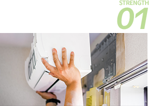 今や生活には欠かせないエアコン。エアコン設置は、実はミリ単位の正確性を要する難しい作業です。本来の性能を発揮できるか否かには、適切な取り付けが大きく影響しています。弊社にお任せいただければ、確かな知識・技術をもとに、設置場所の状況や機種の特徴をしっかりと把握し、最適な施工をお約束いたします。
