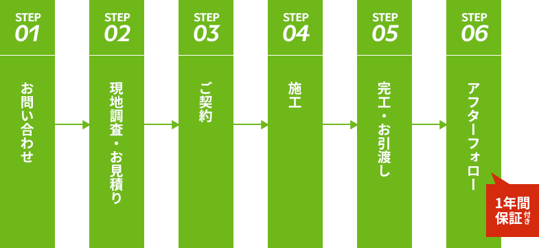 お客様に安心していただくため、施工後1年間の保証制度を設けております。工事が終われば、それで終わるのではなく、そこからのアフターフォローこそが大切。小さなことでも、遠慮せずに、何か気になることがあればご相談ください。丁寧に対応いたします。